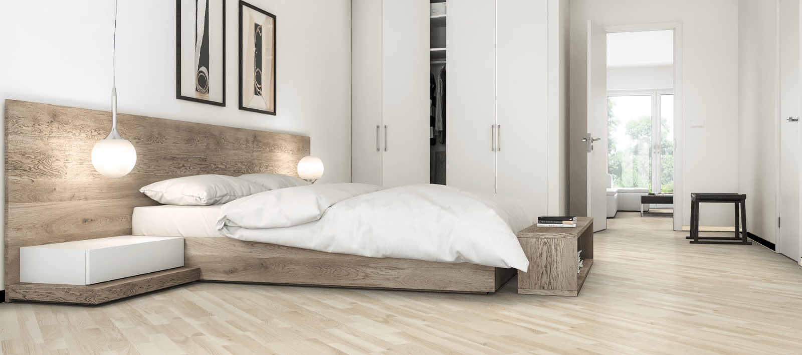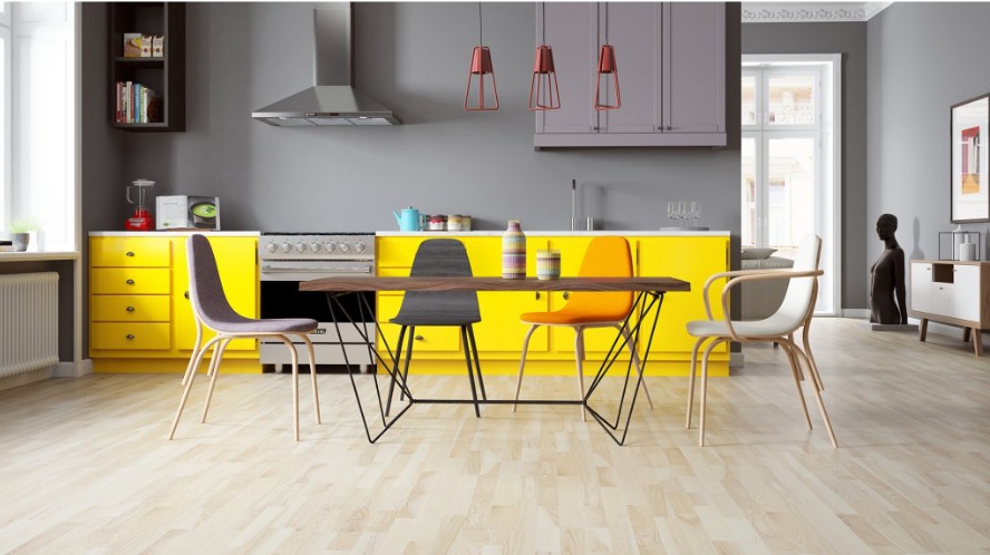 Dřevěná třívrstvá podlaha barvená do světlého odstínu s malým množstvím suků. Povrch podlahy je ošetřený matným lakem.