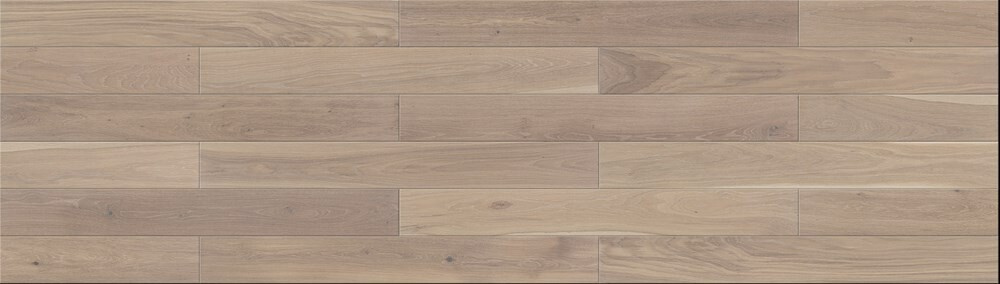 Charakteristika horní vrstvy: Dubové dřevo se suky charakteristickými pro dub. Podlaha se vyznačuje malou proměnlivostí odstínů a letokruhy. Tmavne vlivem UV záření. Barva – bílý olej, čtyřstranná fáze.