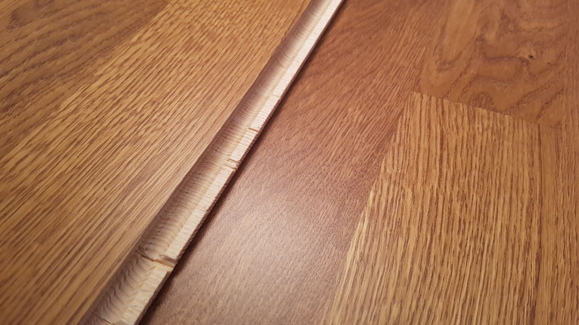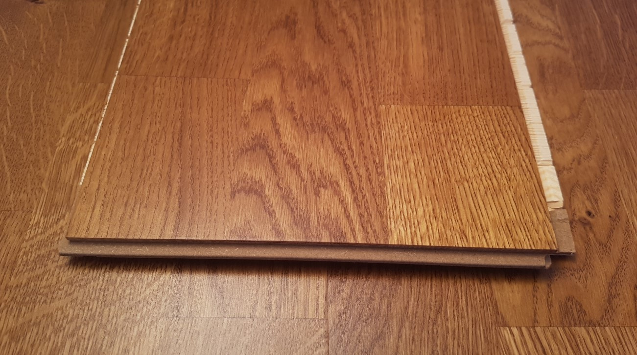 Konstrukce prkna - Podlaha 3-vrstvá: horní vrstva dubové dřevo, střední a dolní vrstva jehličnaté dřevo.