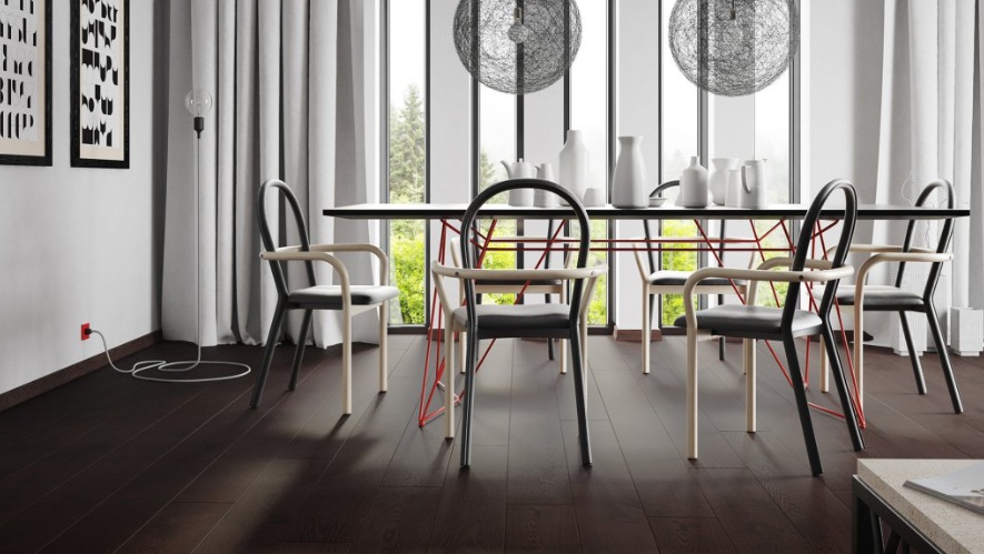 Dřevěná třívrstvá podlaha barvená do tmavého odstínu s velkým množstvím suků. Frézovaná hrana desky dodává podlaze lehkost a hloubku. Povrch podlahy je kartáčovaný a ošetřený matným lakem.