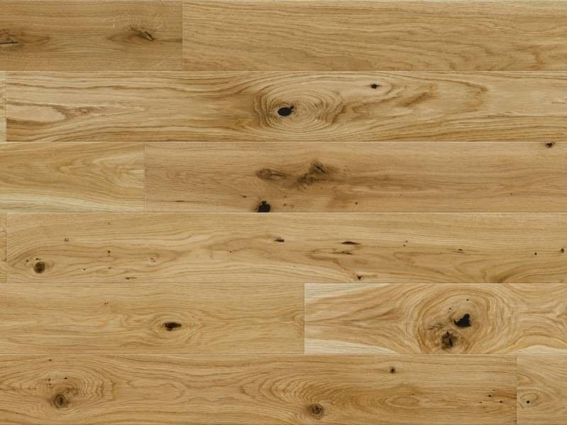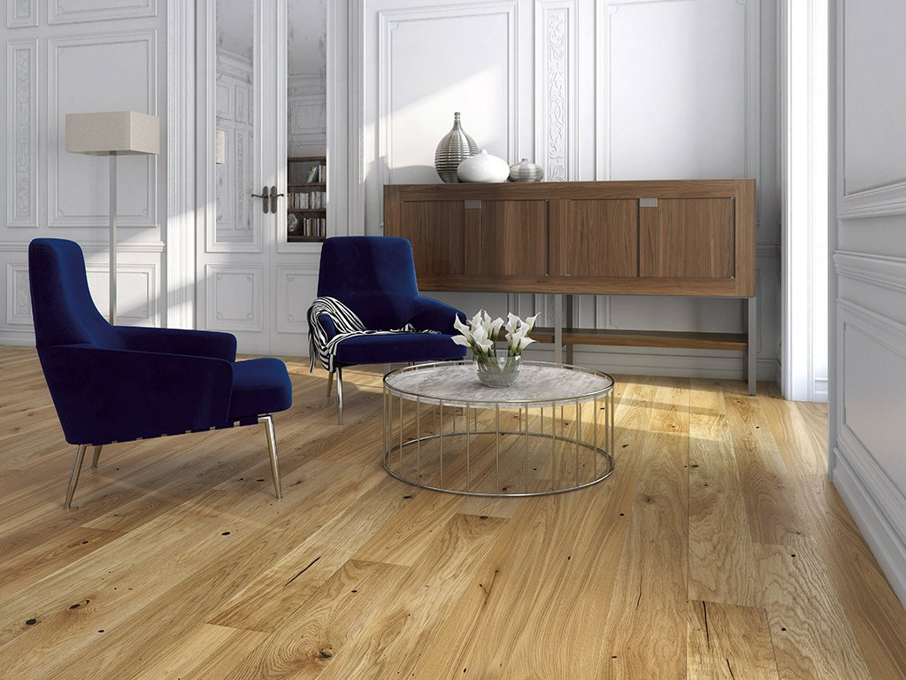 Třívrstvá dřevěná podlaha v přírodním odstínu dřeva s velkým množstvím suků. Frézovaná hrana desky dodává podlaze lehkost a hloubku. Povrch podlahy je kartáčovaný a ošetřený matným lakem.