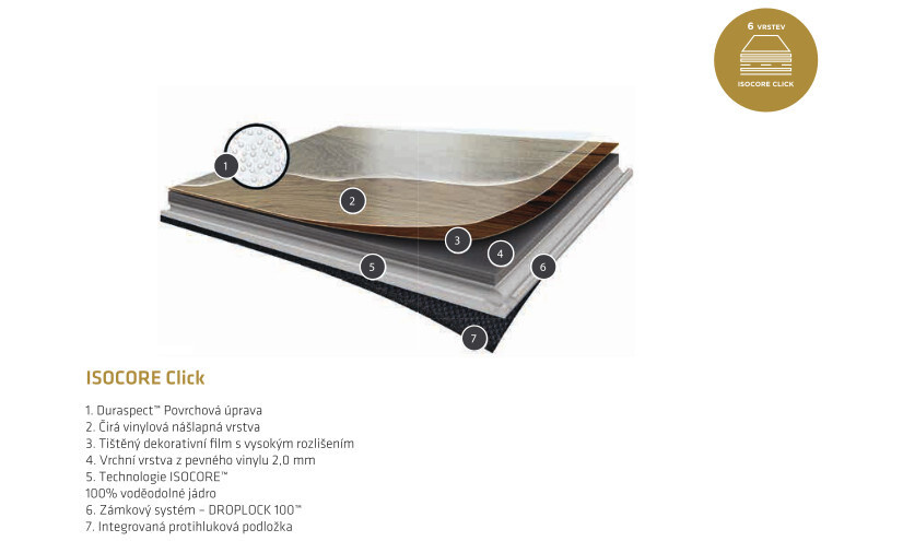 Plovoucí podlahy ISOCORE mají díky speciální technologii 100% voděodolné jádro. Skládají se ze 6 vrstev, včetně integrované protihlukové podložky. Jejich tloušťka je 8 mm, zátěžová třída 33. Záruka na bytové i komerční využití je 20 let.