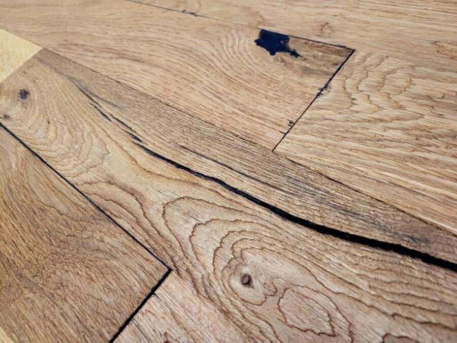 Nerovnoměrným ručně hoblovaným povrchem je dosaženo zcela originálního vzhledu na způsob starých prkenných podlah.