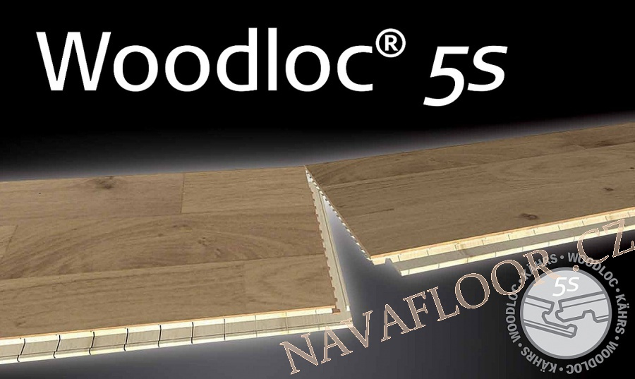 Zámek Woodloc 5s je výsledkem dalšího vývoje a zdokonalení metody Fold - down: Woodloc 5s se vyznačuje maximální přesností mechanického uzamykání. Uzamykací pero z kompozitního materiálu na bázi dřeva je k dispozici výhradně u podlah Kährs. Pomocí Woodloc spoje je dosaženo absolutně rovného povrchu. Lamely se při uzamčení mezi sebou vzájemně stahují a nedochází tak ke vzniku spár.
