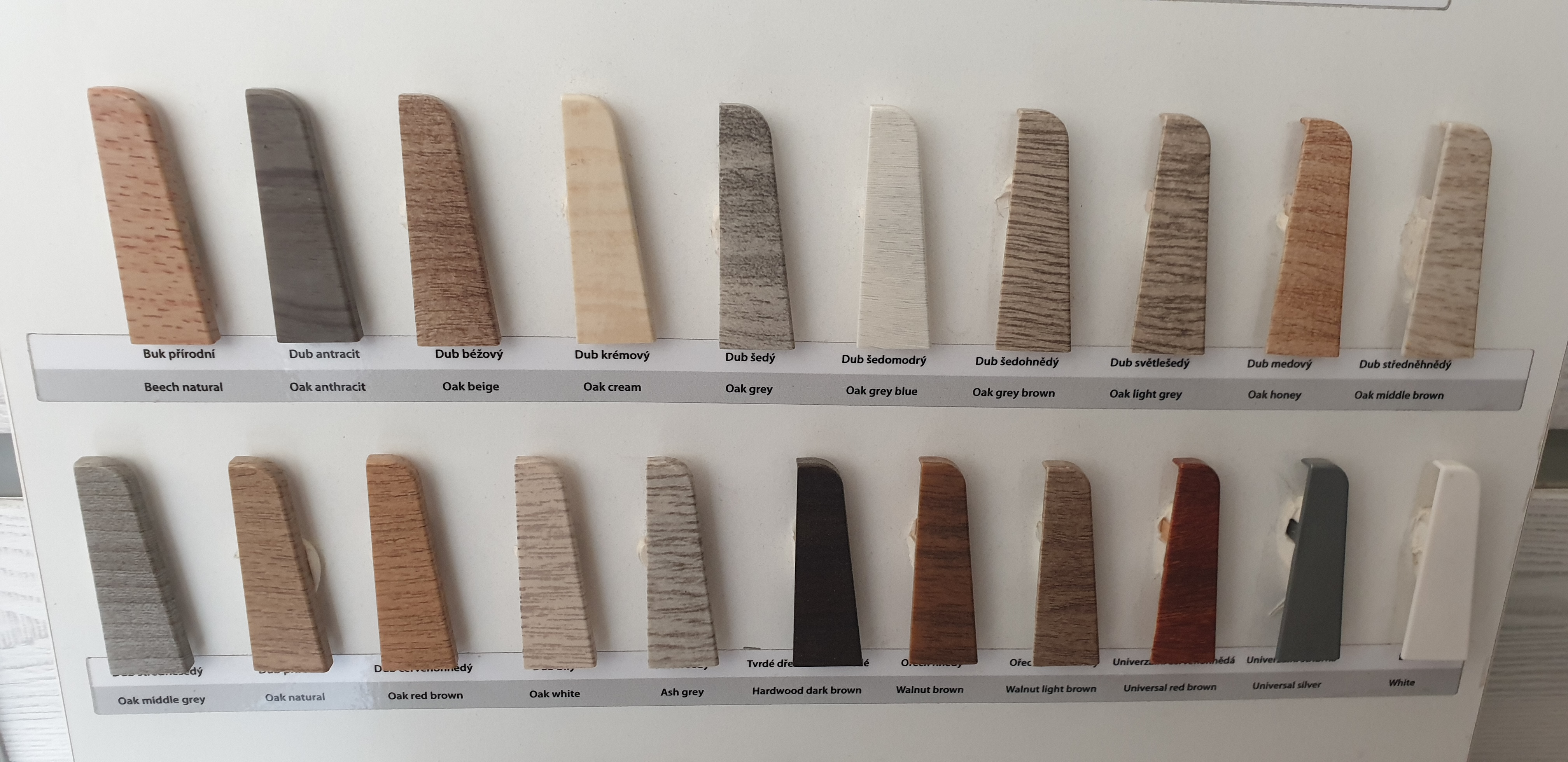 Plastové komponenty k liště Egger jsou vyráběny a dodávány v několika základních odstínech. Při objednávce komponentu je dodáván odstín komponentu nejvhodnější k odstínu lišty.
