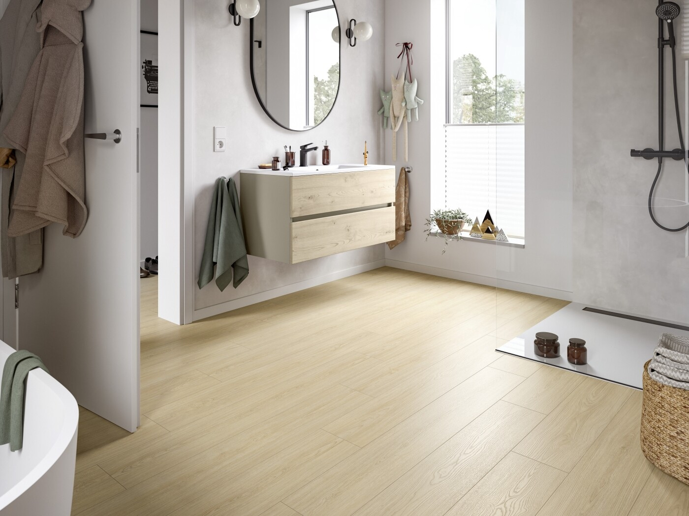 - Odolnost proti vlhkosti: Když podlaha obytných místností pokračuje do vlhkých prostor, vznikají fascinující zákoutí. Laminátové podlahy v provedení Aqua+ mají optimální předpoklady pro pokládání v kuchyních, koupelnách nebo vstupních místnostech a chodbách.