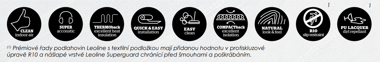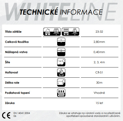 WHITELINE je bytové PVC s třídou zátěže 23, 31. Je specifické v tom, že na spodní straně je nalepena bílá textilní vrstva, která po instalaci zakryje drobné nerovnosti povrchu, zvyšuje kročejový útlum a přináší větší komfort tepla.