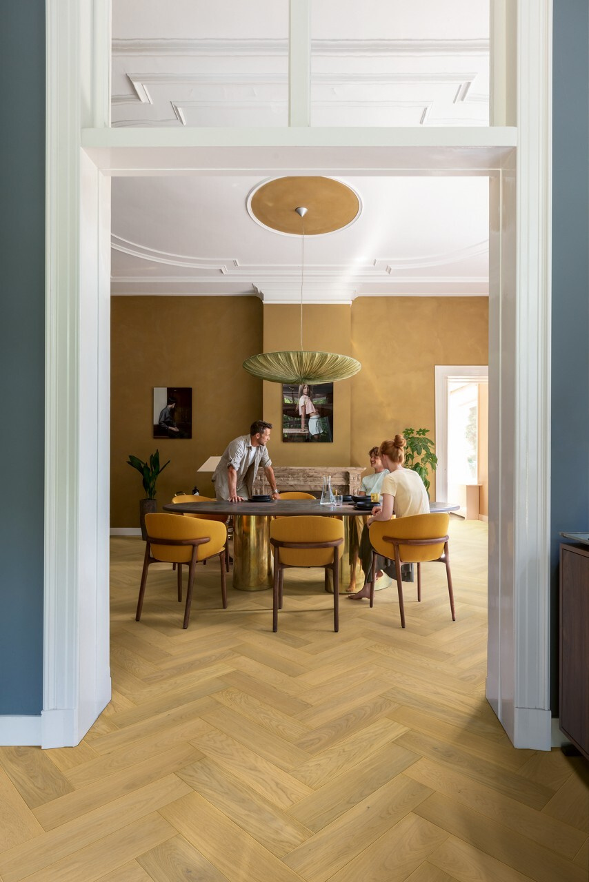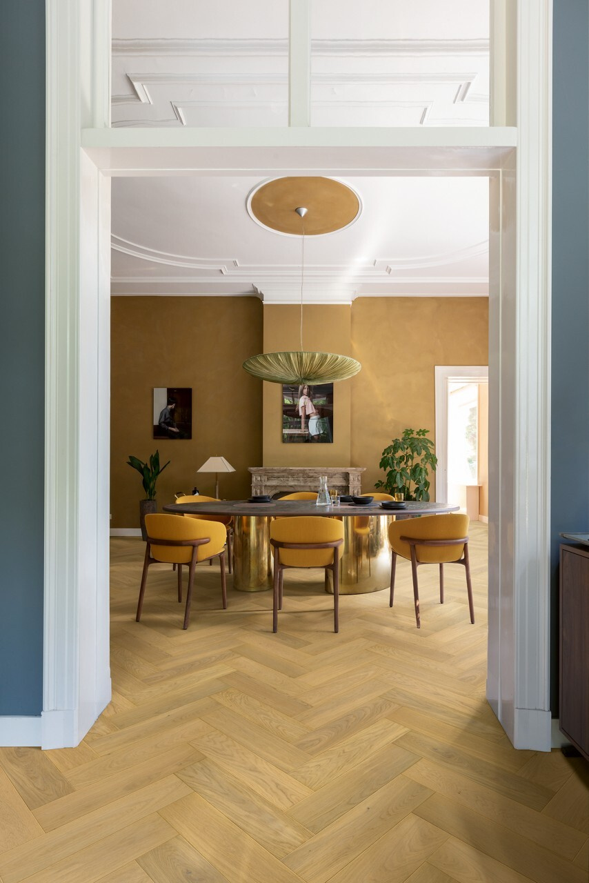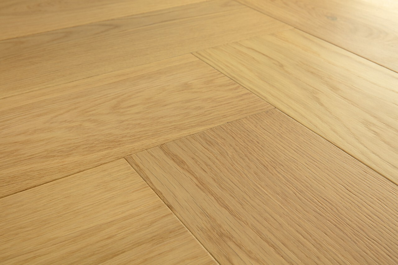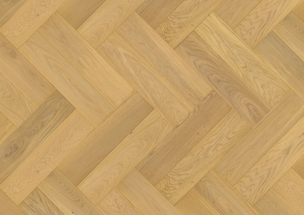 Tato dřevěná podlaha s vzorem rybí kosti kombinuje eleganci, přírodní vzhled dubu a funkčnost. Dokonale se hodí jak do klasických interiérů, tak do moderních designů a dodává místnostem jedinečný charakter.