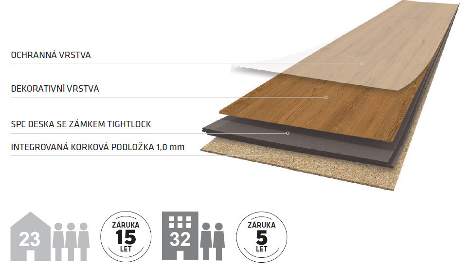 Podlahy Merit SPC se skládají ze směsi polymeru a vápence a její součástí je i integrovaná korková podložka.