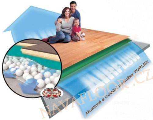 Exkluzivní technologie AIRFLOW umožňuje účinné proudění vzduchu mezi podkladní vrstvou podlahy a vrchní krytinou. Zabraňuje tím vzniku plísní mezi podkladní vrstvou a parozábranou, kterou tvoří horní vrstva podložky TUPLEX, opatřená přesahy.